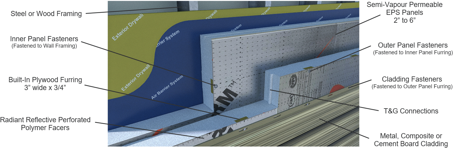 Large-scale commercial buildings commonly rely on layered assemblies that require thermal clips, Z-girts, hat channels, plywood, and various attachment components. While these assemblies can achieve acceptable energy efficiency, they demand substantial labour, careful sequencing, and frequent coordination between trades.